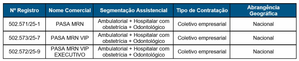 Desta forma, informamos que a partir de 12 de janeiro de 2026, o seu contrato de credenciamento junto à VALE/PASA contemplará o Plano Empresarial PASA MRN, que possui segmentação: ambulatorial, hospitalar com obstetrícia e odontológica. O novo plano tem abrangência para atendimento nacional.